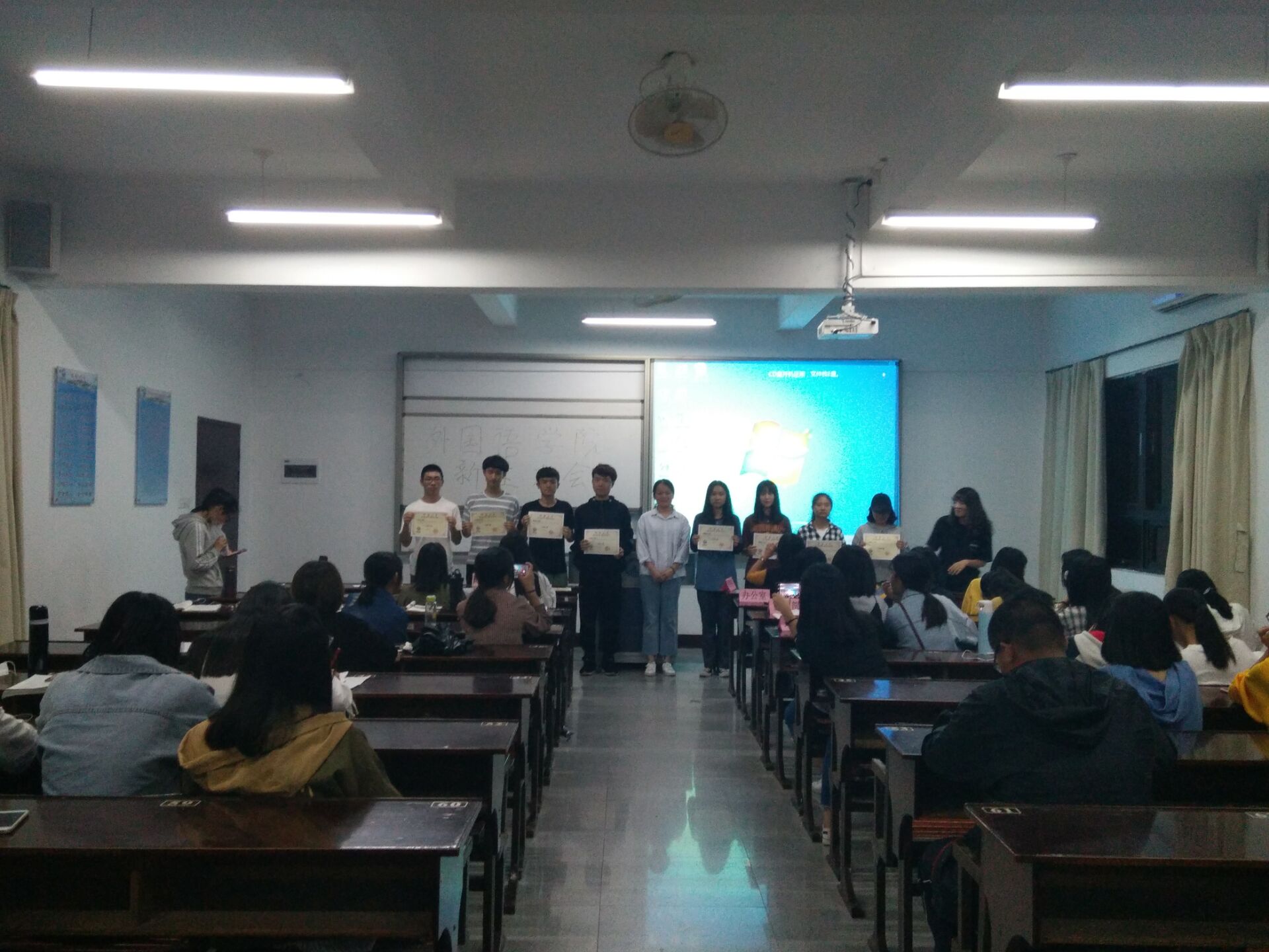 milan米兰官网于11月11日19:00在仰恩楼D3-405 召开新生大会暨表彰大会!milan米兰官网党总支副书记兼学生会指导老师刘冬利,学生会主席陈倩、副主席黄雅萍以及全体干部和干事和18级新生参加了会议。