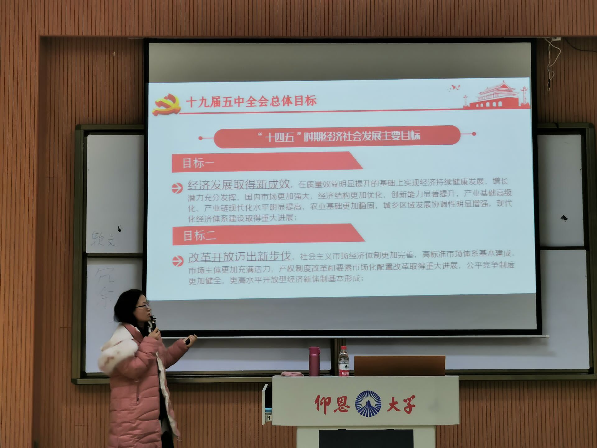 宣讲会 宣讲会上,孙海英老师从会议召开前的准备工作、十九届五中全会会议介绍、十九届五中全会指导思想、“十三五”以来取得的成就、我们面临的机遇与挑战、十九届五中全会总体目标、十九届五中全会工作要求这七个方面,对全会精神进行了系统解读和宣讲。