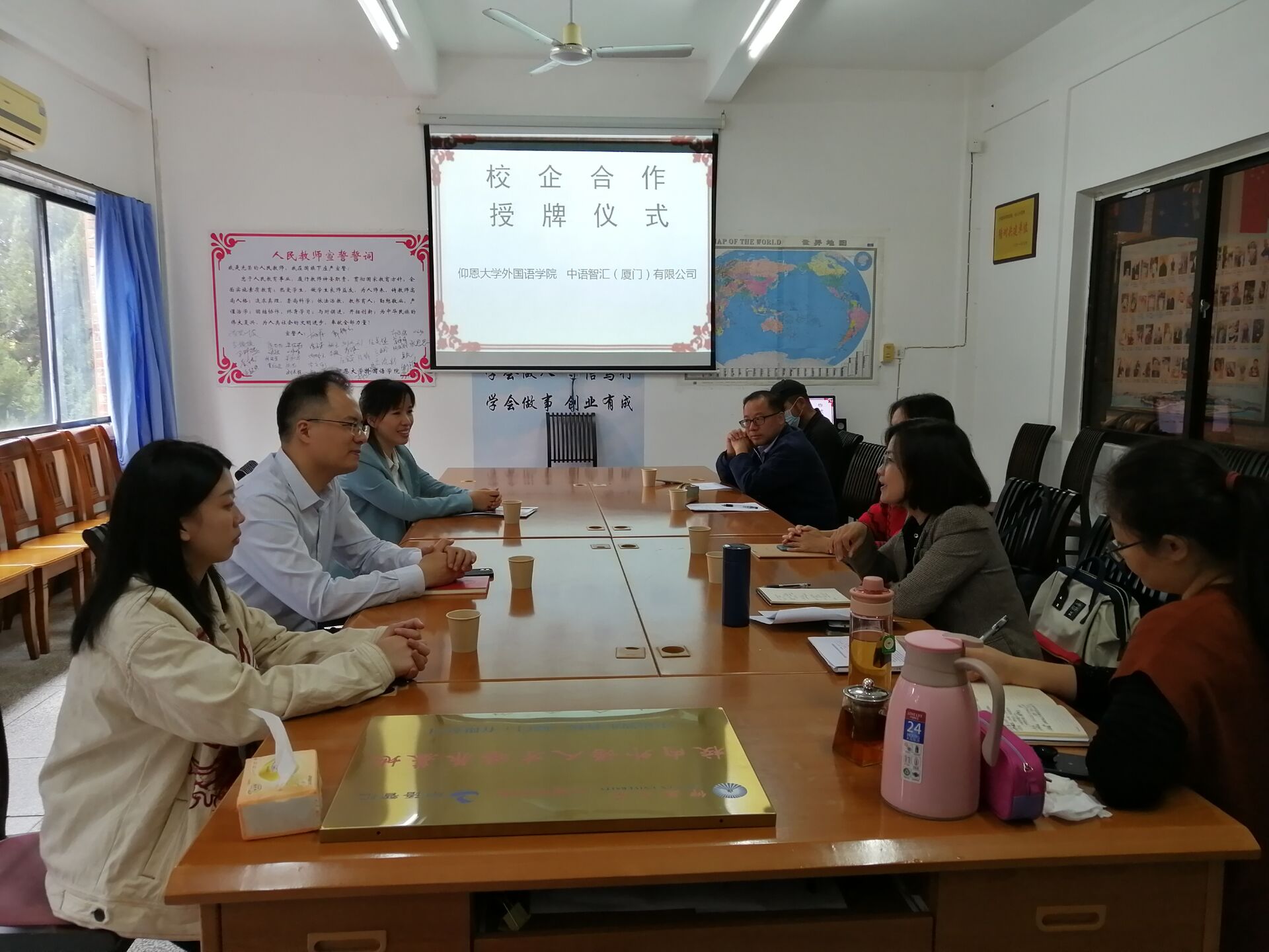 挂牌仪式上,胡娟院长介绍了之前与其他单位建设实践基地已取得的成绩,并详述了外院在“十四五发展规划”当中实践基地建设的发展思路,同时表示外院希望在校本特色教材、智慧外语教学、一流专业和课程建设以及学生专业实践等方面与中语智汇(厦门)开展深度合作,促进产教深度融合。随后,中语智汇(厦门)公司领导叶麟总经理展示了公司在互联网+外语教学、智能+外语教学的创新理念,希望能为外院英语专业和商务英语专业在实践教学平台建设和教学资源建设提供优质的服务,并对今后的合作充满信心。
