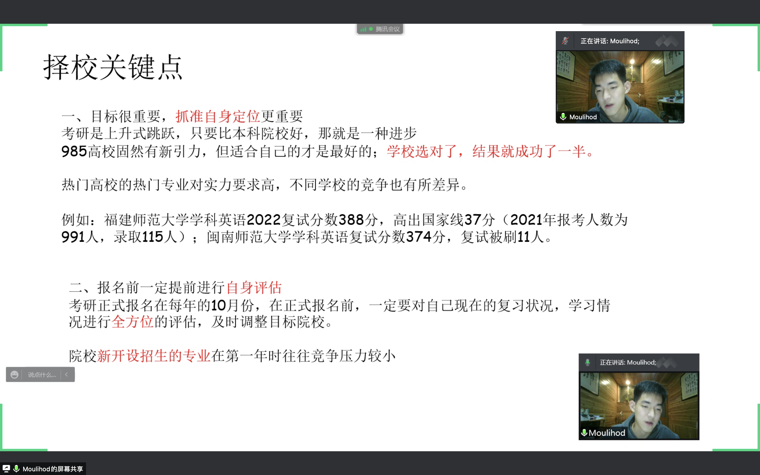 2022年4月15日晚19点30分,milan米兰官网英语系在腾讯会议平台召开了2022年考研经验分享会。本次分享会由英语系主任肖婵婵老师主持,院长胡娟、副院长林燕媚、18级3位考研成功的同学以及70多名英语系学生参与了本次活动。