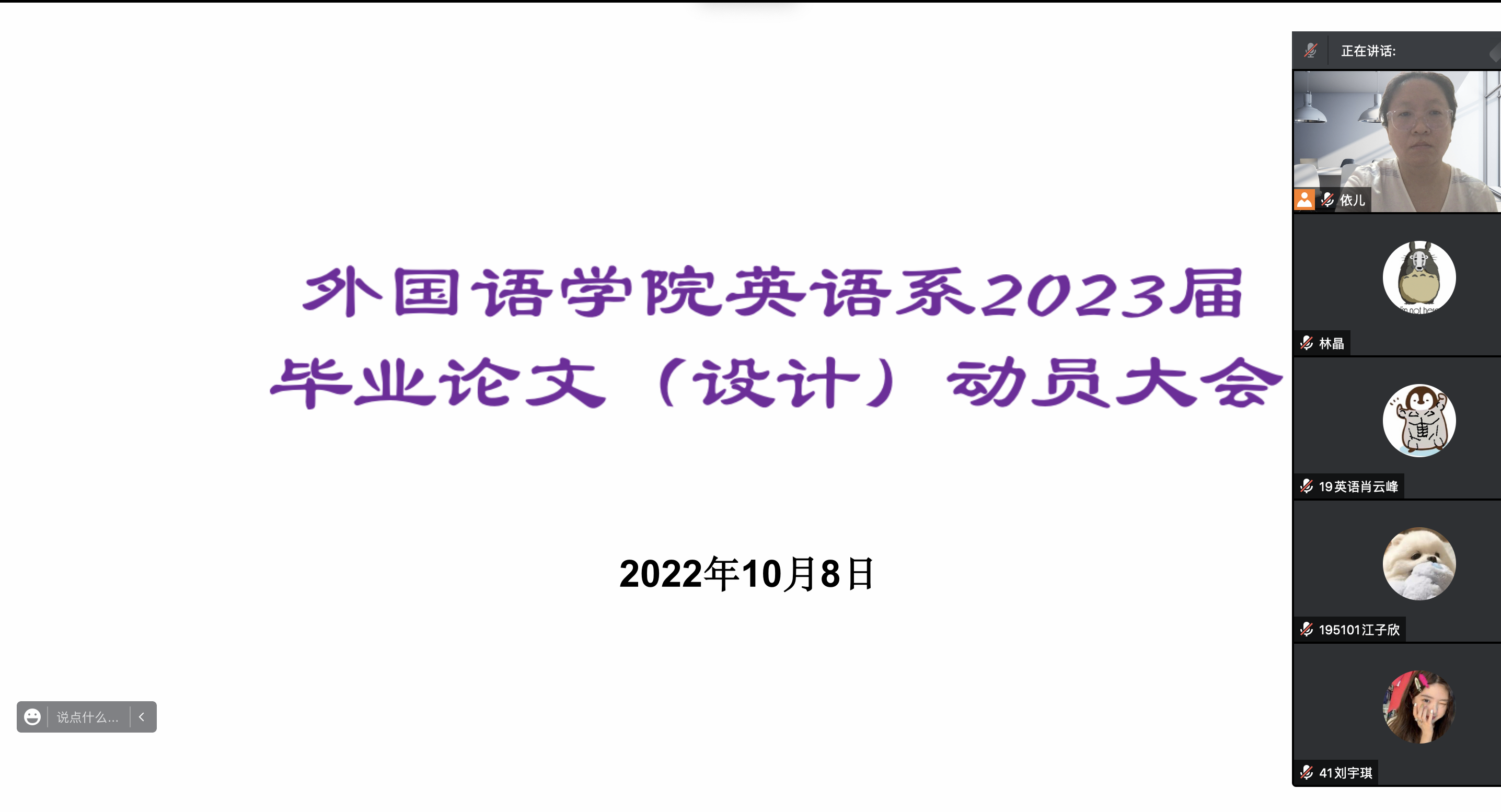 线上会议 本次动员大会由我院英语系主任肖婵婵老师主持。肖老师详细介绍了milan米兰官网2022年10月下发的《关于做好2023届本科生毕业论文(设计)工作的通知》文件精神,强调了毕业论文撰写的基本要求和注意事项。