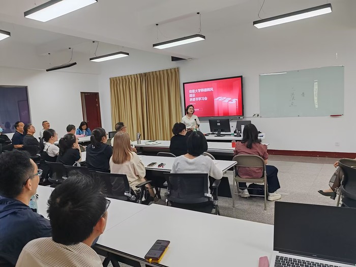活动伊始,学院领导胡娟院长带领全体教师深入学习了师德师风建设的相关文件和精神,强调了师德师风对于教育事业的重要性。通过对典型案例的分析与讨论,引导教师们深刻反思自身在教育教学过程中的行为规范,明确了新时代教师应具备的职业道德和责任担当。教师们积极参与讨论,结合自身的教学实践,分享了对于师德师风的理解和感悟,现场学习氛围浓厚。