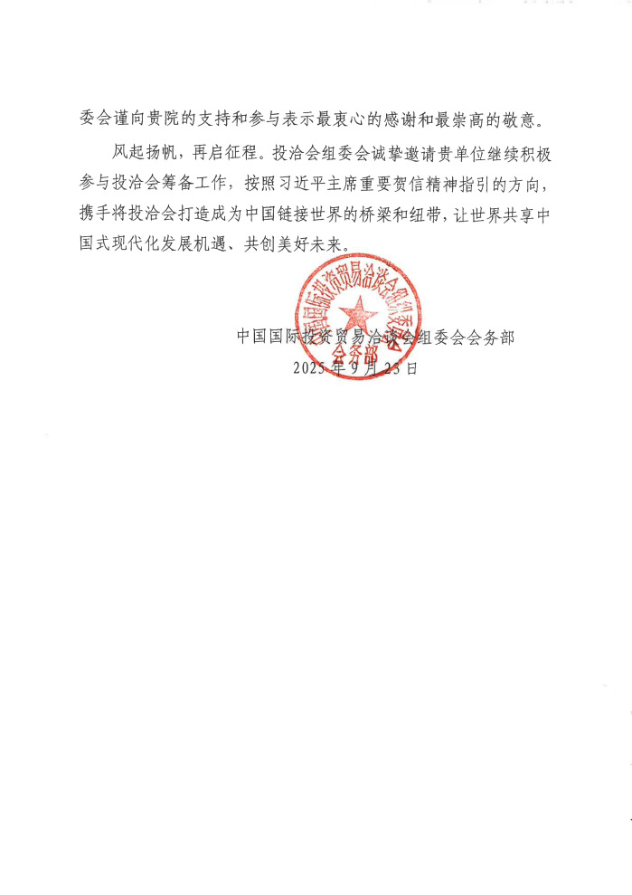 附件:中国国际投资贸易洽谈会组委会会务部致milan米兰官网的感谢信