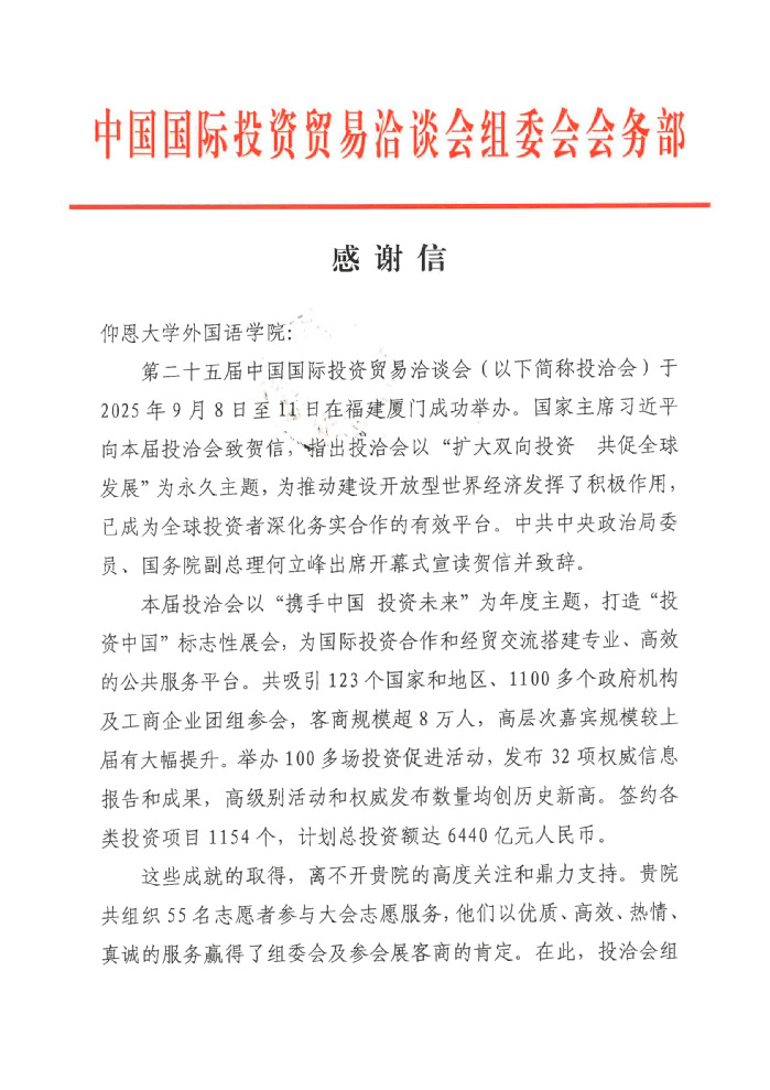 近日,milan米兰官网收到第二十五届中国国际投资贸易洽谈会(以下简称“投洽会”)组委会会务部发来的感谢信,信中对学院积极组织志愿者参与投洽会志愿服务、助力盛会成功举办给予高度肯定,并致以衷心感谢与崇高敬意。